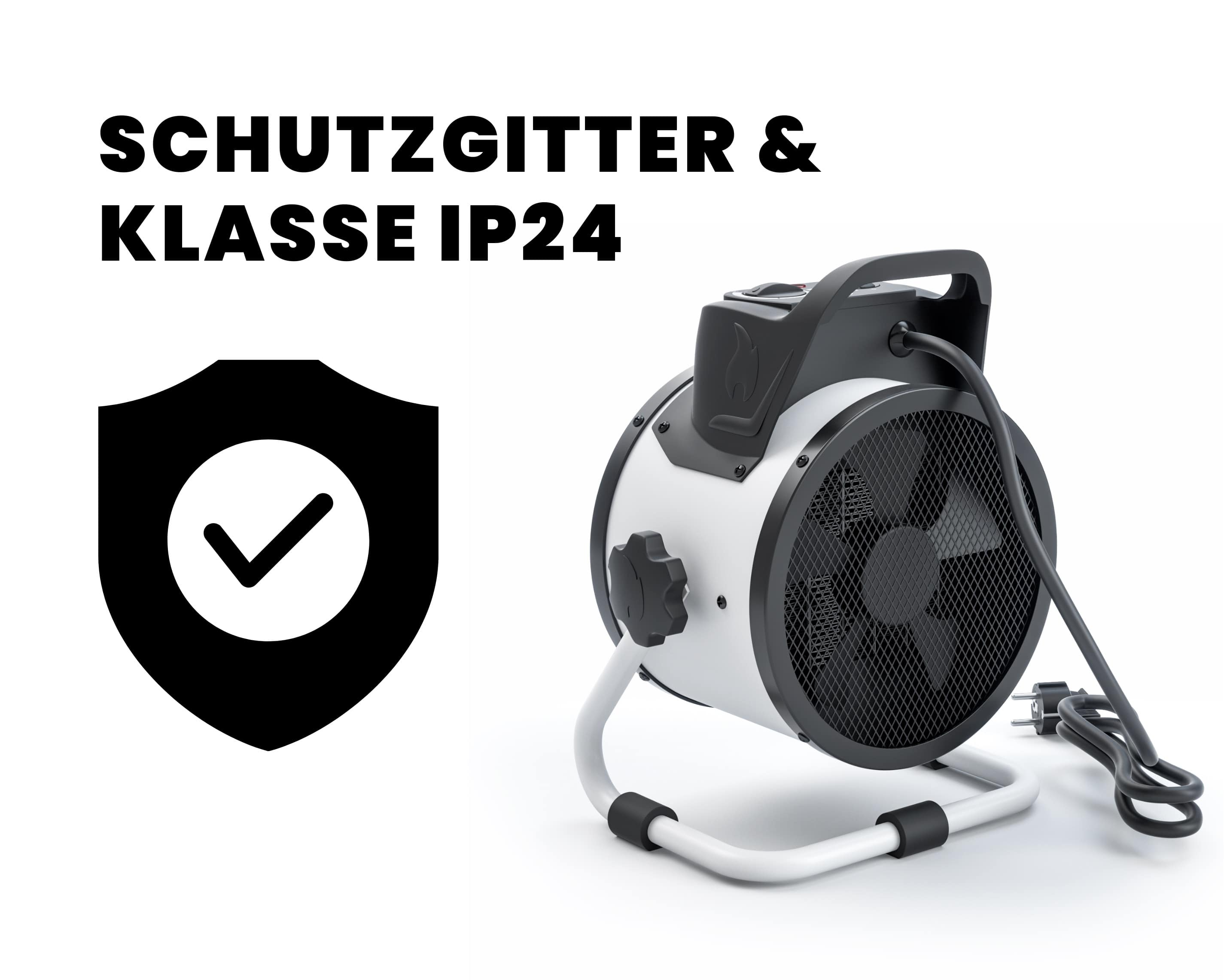 Unserer Heizlüfter ist mit einem Schutzgitter ausgestattet und zertifiziert mit der Schutzklasse IP24 wir bieten also einen höheren Schutz gegen Wasser und Fremdkörper für maximale Sicherheit bei dir Zuhause.
