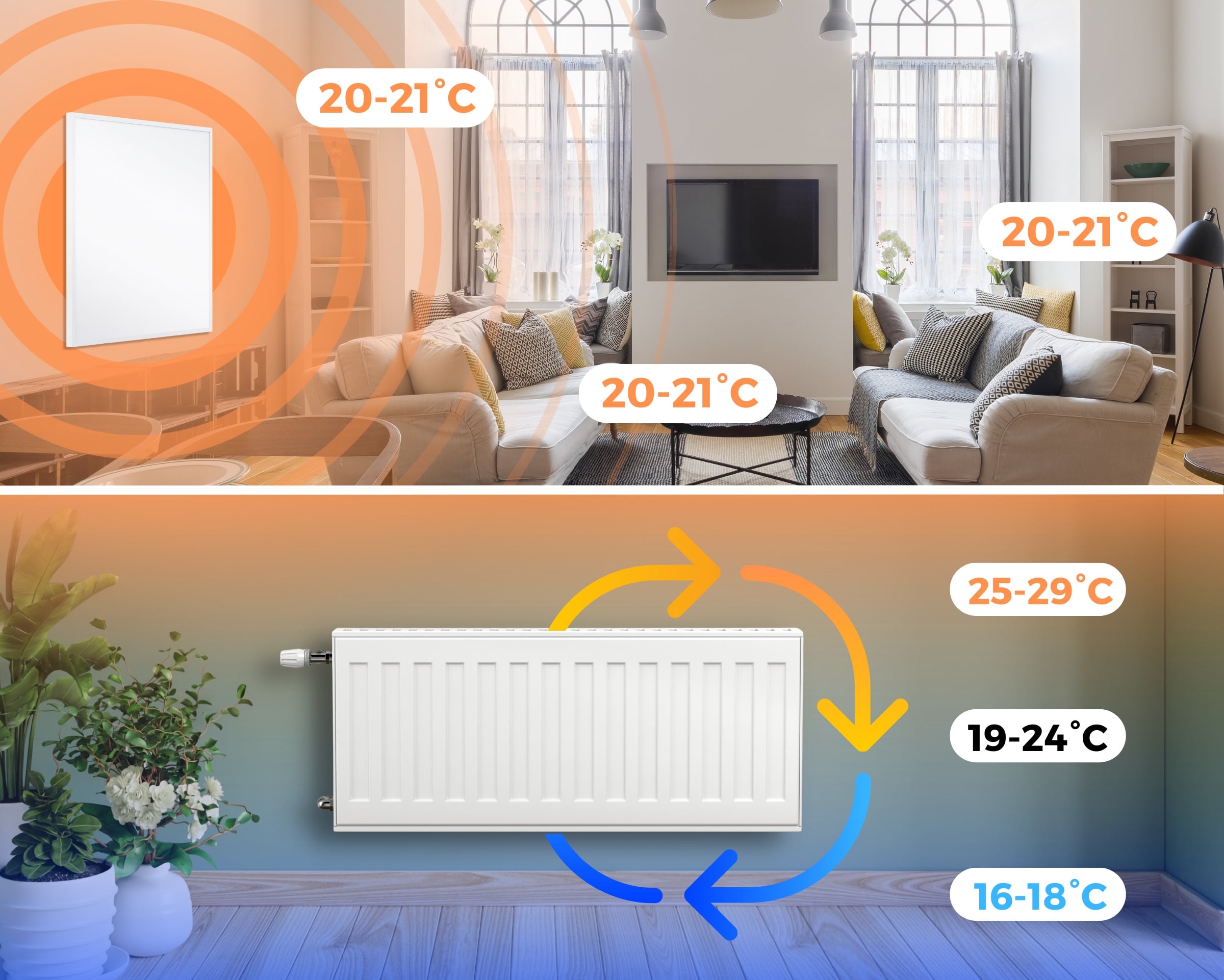 Unsere Infrarotheizung erwärmt durch Infrarotstrahlen den ganzen Raum! Bei einem herkömmlichen Heizkörper steigt die warme Luft nach oben, somit heizt dieser sehr ineffizient!