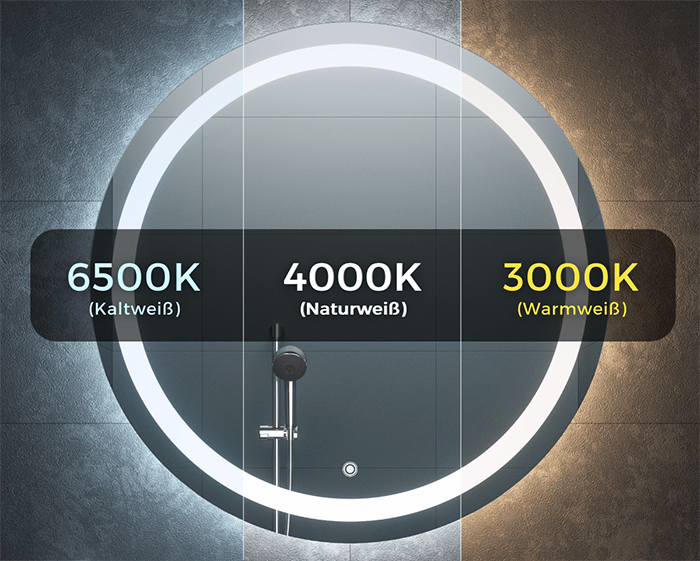 Unser Badspiegel bietet drei verschiedene LED-Farben: Kaltweiß, Neutralweiß und Warmweiß.