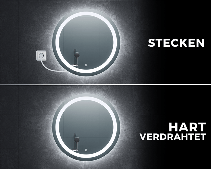 Sie können ihn entweder mit einem Stecker anschließen oder hart verdrahten. Mit dem Stecker haben Sie die Möglichkeit, den Spiegel einfach an eine Steckdose anzuschließen, während die hart verdrahtete Option eine festere Installation ermöglicht. So können Sie den Spiegel ganz nach Ihren Bedürfnissen und Vorlieben an Ihre Stromversorgung anpassen.