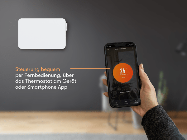 Steuerung per Fernbedienung, Thermostat am Gerät oder über Smartphone App möglich.